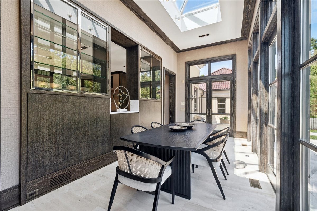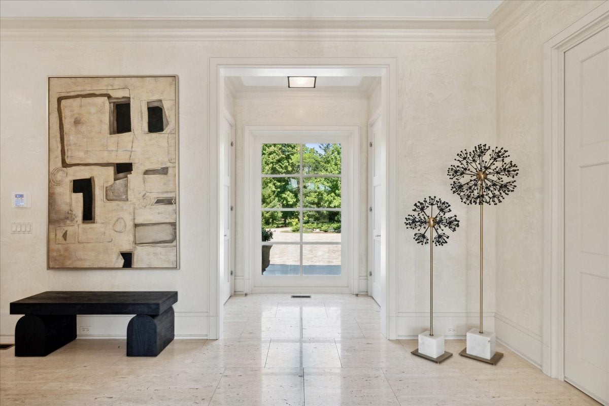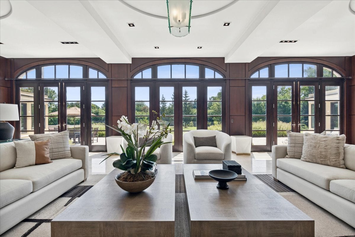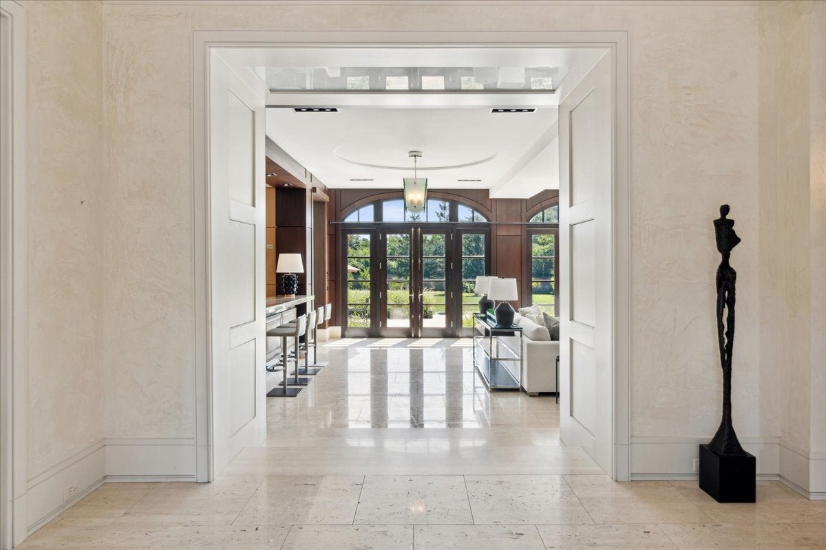 Nestled in the heart of East Lake Forest, this exquisite estate seamlessly blends elegant architecture with natural splendor, set on nearly three gated acres. Crafted in collaboration with the esteemed architect Darcy Bonner in 2010, it epitomizes a harmonious fusion of style, functionality, and serene Santa Barbara-inspired living. The property is enveloped by pollinating gardens, native flora, and a fruit orchard, offering abundant privacy. The home's design features clean lines, soaring ceilings, and expansive windows that bathe each room in natural light while providing breathtaking views. The grand foyer opens into a spacious living room, centered around a bronze-clad fireplace and a chic bar, with multiple French doors leading to a stone terrace. The dining room is equally captivating, boasting a glass fireplace, a platinum leaf ceiling, and hardwood floors with a distinctive nickel inlay. The first-floor primary suite serves as a true retreat, complete with a cozy fireplace, a sunroom, and a luxurious bath featuring ebony vanities, a large steam shower, and a waterfall jetted tub. French doors reveal a private, fully enclosed patio. The custom-designed dressing room includes English hickory built-ins and unique accents, while a discrete staircase ascends to a secluded meditation or yoga room on the third floor, and a second expansive dressing room below. A charming sitting room with vaulted ceilings, a fireplace, and elegant built-ins includes a hidden door to a leather-clad library adorned with a striking fireplace and art niches. For culinary enthusiasts, the kitchen is a dream, showcasing stunning cerused white oak cabinets with polished nickel details and a substantial center island topped with Carrera marble. An adjacent sunlit breakfast room and a butler's pantry with a dumbwaiter elevator enhance convenience. The spacious family room features high barreled ceilings, a limestone-surround fireplace, and connects to the sunroom, which opens to the pool, spa, and outdoor kitchen. The upper level houses six generous family bedrooms, each with private baths featuring skylights, walk-in closets, and wide plank quarter-sawn hardwood floors. The lower level is entertainment-ready, with a large recreational room, a movie room, a service kitchen, a climate-controlled wine and tasting room, a private bedroom suite, a fully equipped gym, and locker rooms with full baths for easy pool access. Externally, the estate boasts a stucco facade, a beautiful Ludowici tile roof, copper gutters, and Jerusalem limestone terraces. Outdoor amenities include a large pool, infinity-edge spa w/ waterfall, a spacious stone kitchen, and a 4-car garage with radiant heat. Additional features are a motor court, a granite cobblestone driveway with snowmelt in the porte-cochere, a whole-house generator, and more. With eight fireplaces, an elevator, and an abundance of luxurious details including exotic woods, Venetian marbled walls, and unique light fixtures from Paris, this estate offers unparalleled comfort, privacy, and style in Lake Forest.