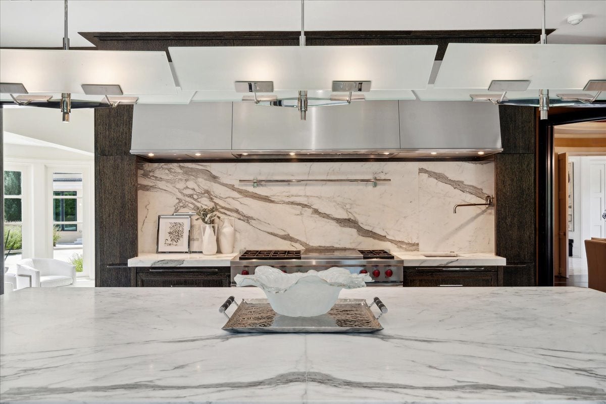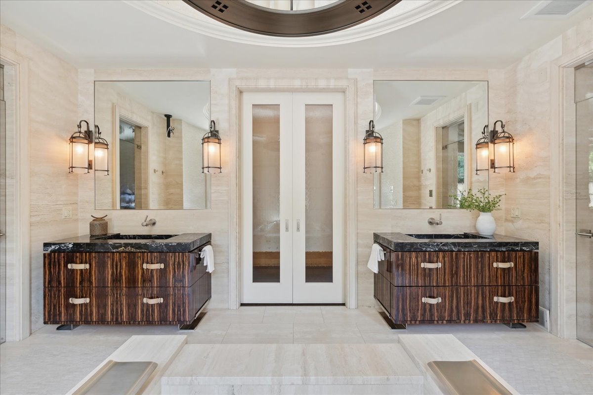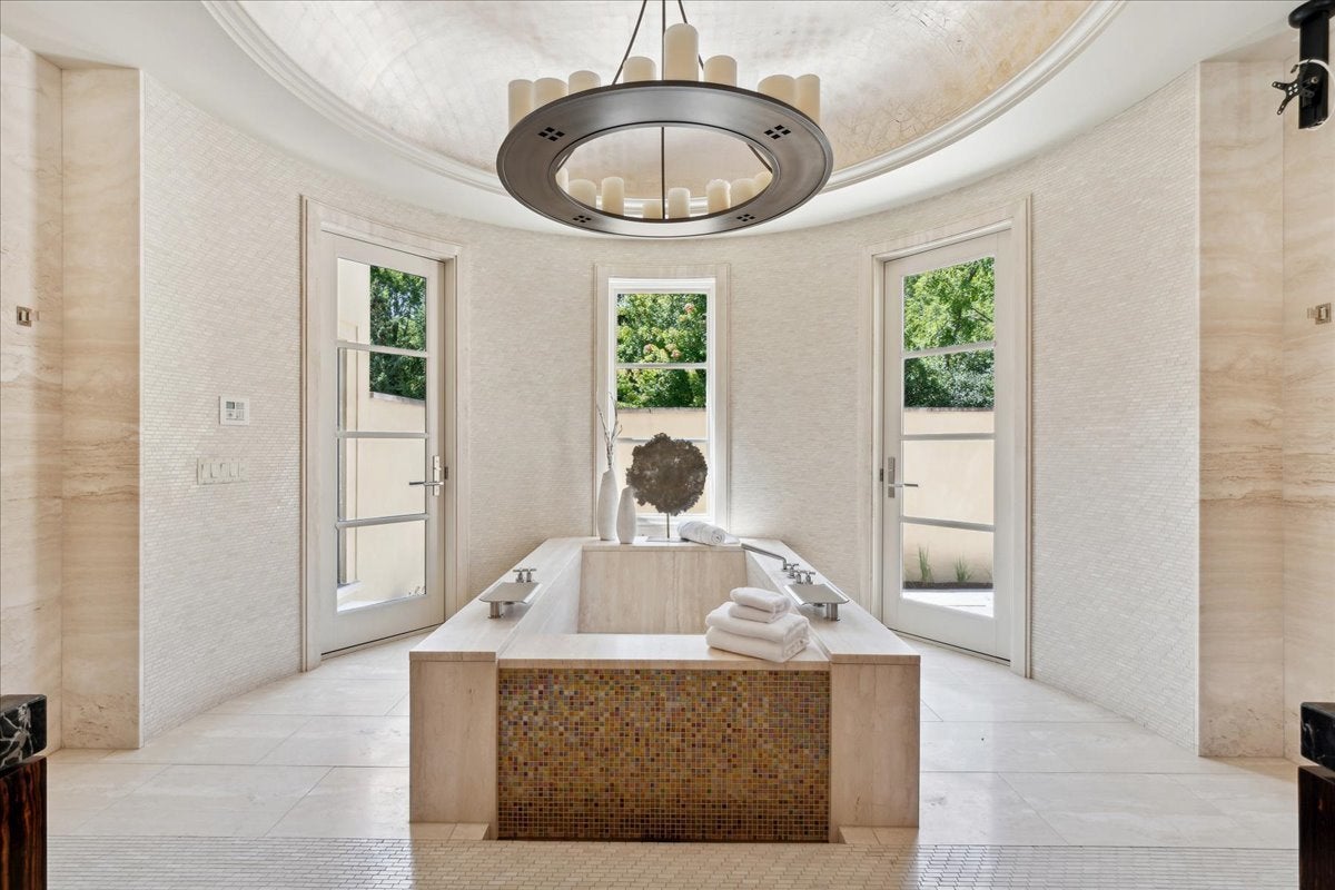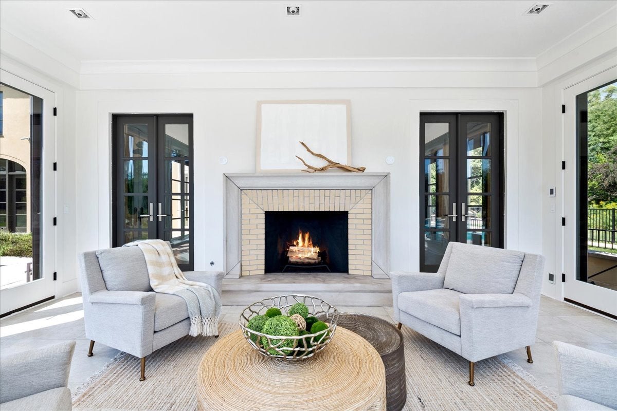 Nestled in the heart of East Lake Forest, this exquisite estate seamlessly blends elegant architecture with natural splendor, set on nearly three gated acres. Crafted in collaboration with the esteemed architect Darcy Bonner in 2010, it epitomizes a harmonious fusion of style, functionality, and serene Santa Barbara-inspired living. The property is enveloped by pollinating gardens, native flora, and a fruit orchard, offering abundant privacy. The home's design features clean lines, soaring ceilings, and expansive windows that bathe each room in natural light while providing breathtaking views. The grand foyer opens into a spacious living room, centered around a bronze-clad fireplace and a chic bar, with multiple French doors leading to a stone terrace. The dining room is equally captivating, boasting a glass fireplace, a platinum leaf ceiling, and hardwood floors with a distinctive nickel inlay. The first-floor primary suite serves as a true retreat, complete with a cozy fireplace, a sunroom, and a luxurious bath featuring ebony vanities, a large steam shower, and a waterfall jetted tub. French doors reveal a private, fully enclosed patio. The custom-designed dressing room includes English hickory built-ins and unique accents, while a discrete staircase ascends to a secluded meditation or yoga room on the third floor, and a second expansive dressing room below. A charming sitting room with vaulted ceilings, a fireplace, and elegant built-ins includes a hidden door to a leather-clad library adorned with a striking fireplace and art niches. For culinary enthusiasts, the kitchen is a dream, showcasing stunning cerused white oak cabinets with polished nickel details and a substantial center island topped with Carrera marble. An adjacent sunlit breakfast room and a butler's pantry with a dumbwaiter elevator enhance convenience. The spacious family room features high barreled ceilings, a limestone-surround fireplace, and connects to the sunroom, which opens to the pool, spa, and outdoor kitchen. The upper level houses six generous family bedrooms, each with private baths featuring skylights, walk-in closets, and wide plank quarter-sawn hardwood floors. The lower level is entertainment-ready, with a large recreational room, a movie room, a service kitchen, a climate-controlled wine and tasting room, a private bedroom suite, a fully equipped gym, and locker rooms with full baths for easy pool access. Externally, the estate boasts a stucco facade, a beautiful Ludowici tile roof, copper gutters, and Jerusalem limestone terraces. Outdoor amenities include a large pool, infinity-edge spa w/ waterfall, a spacious stone kitchen, and a 4-car garage with radiant heat. Additional features are a motor court, a granite cobblestone driveway with snowmelt in the porte-cochere, a whole-house generator, and more. With eight fireplaces, an elevator, and an abundance of luxurious details including exotic woods, Venetian marbled walls, and unique light fixtures from Paris, this estate offers unparalleled comfort, privacy, and style in Lake Forest.