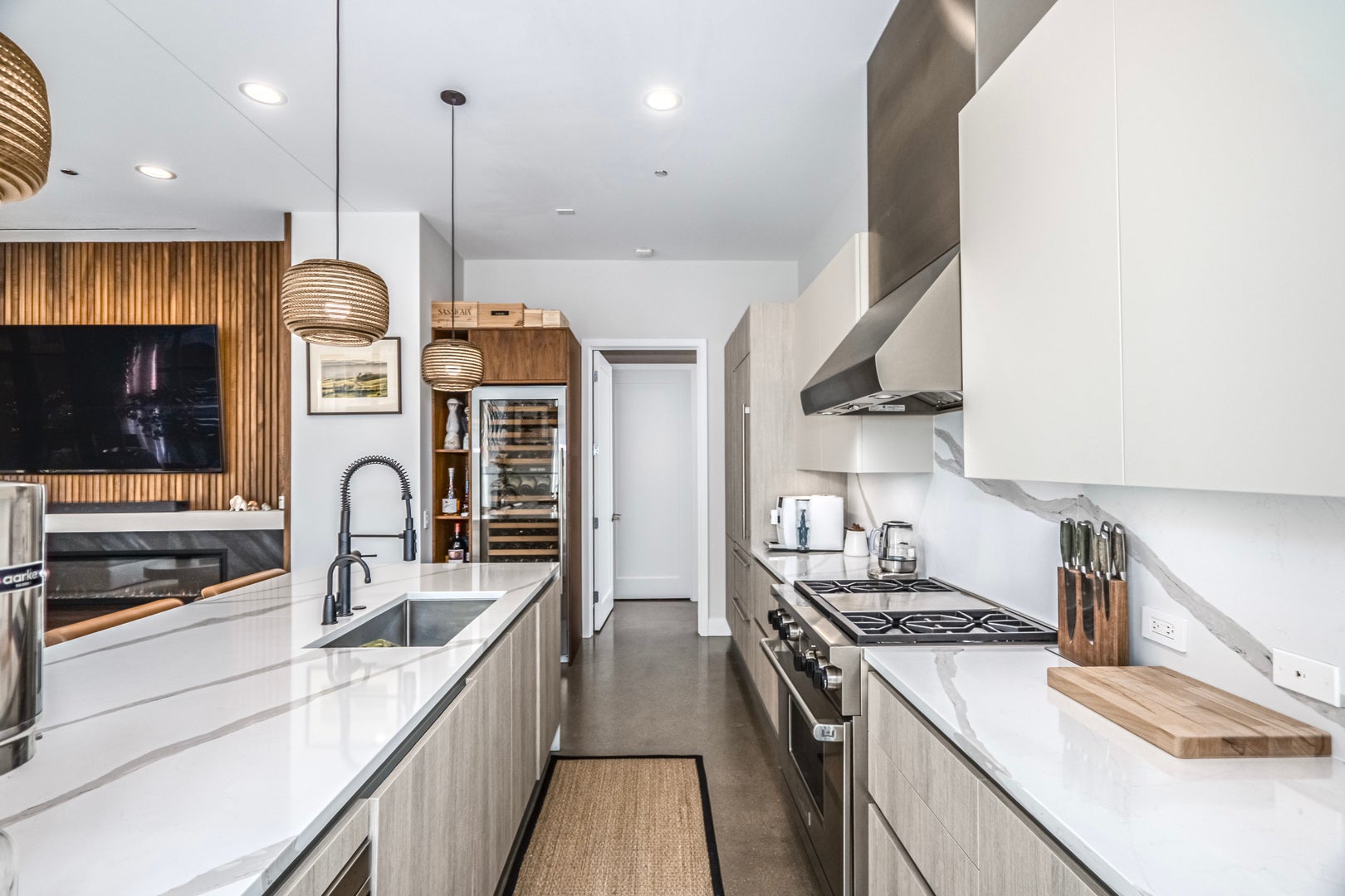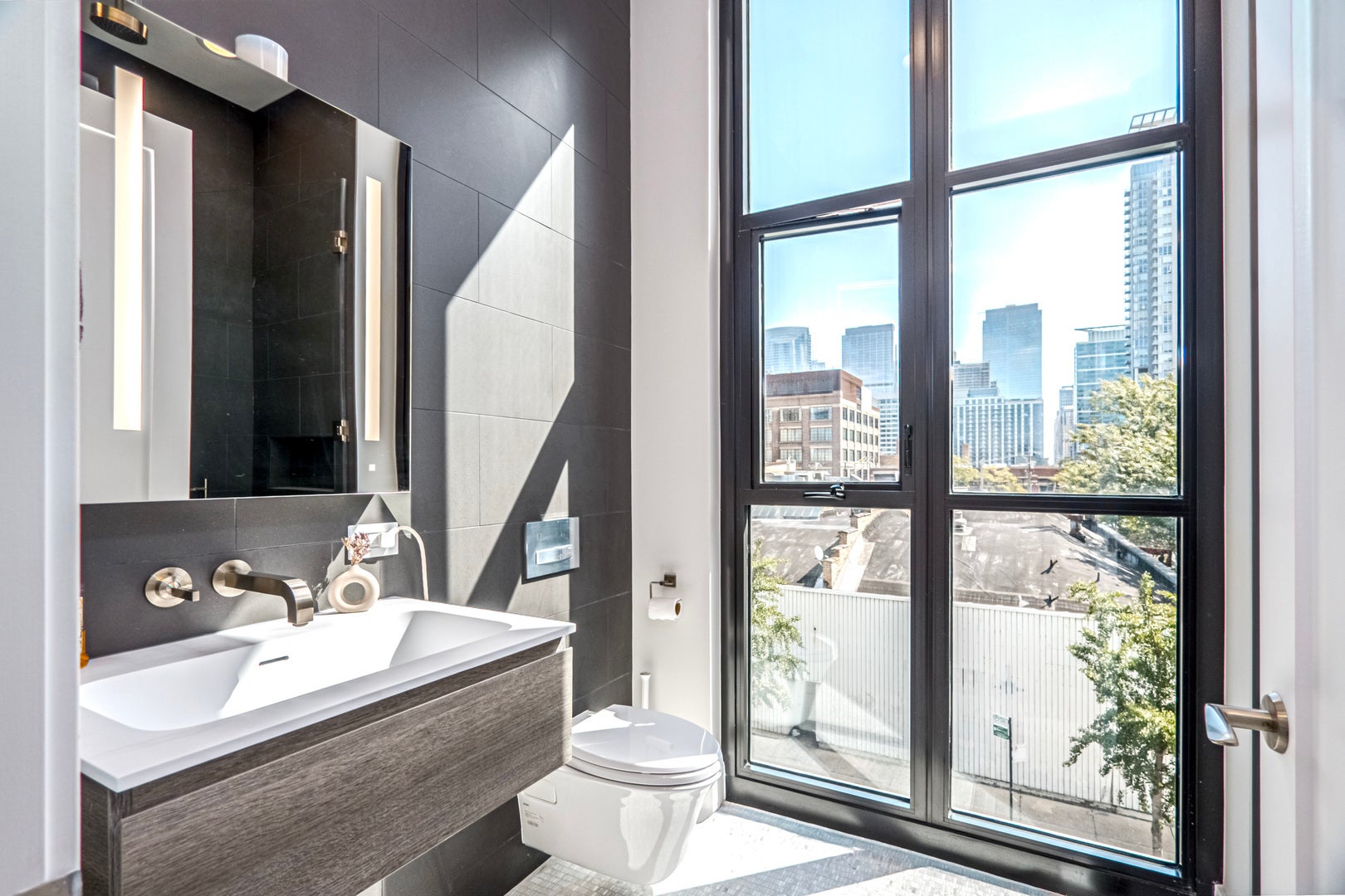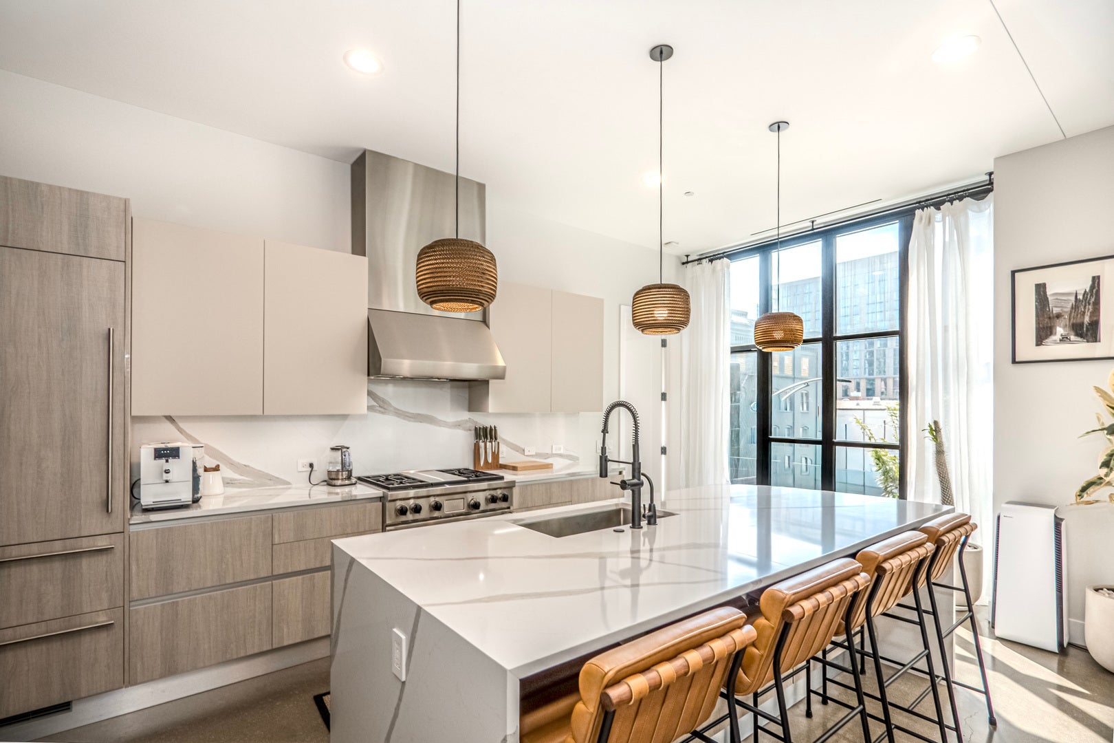 Refined elegance meets modern sophistication in this bespoke 2-bedroom, 2.1-bath residence at 900 West Washington, one of the West Loop's most exclusive LEED Gold-certified boutique buildings. A private elevator opens into a gracious foyer, where soaring 10'6" ceilings, radiant-heated polished concrete floors, and expansive sound-insulated windows with custom automated blinds set the tone for sophisticated living. The open-concept living and dining areas are anchored by a meticulously designed fireplace and flow seamlessly to a private terrace with recessed lighting and a gas line-perfect for year-round entertaining. At the heart of the home, the chef's kitchen blends form and function with custom Italian Scavolini cabinetry, Sub-Zero and Wolf appliances, a dramatic 10-foot quartz waterfall island, and a custom wine refrigerator. The primary suite is a private retreat, enhanced by bespoke wall detailing and integrated nightstands that echo the fireplace design. A custom walk-in closet leads to the spa-inspired bath, featuring dual floating vanities, Hansgrohe/Axor fixtures, a frameless glass shower, heated towel bars, and an illuminated Robern mirror. The second bedroom offers its own en suite bath with a sleek glass shower and generous closet space. Additional highlights include a full-size laundry room with LG washer/dryer and custom storage, Nest thermostat, radiant-heated sidewalks. The residence includes garage parking with a private car lift. With only 22 architecturally significant homes, 900 West Washington offers unmatched exclusivity and convenience-just steps from Fulton Market, Michelin-starred dining, designer boutiques, SoHo House, and Mary Bartelme Park.