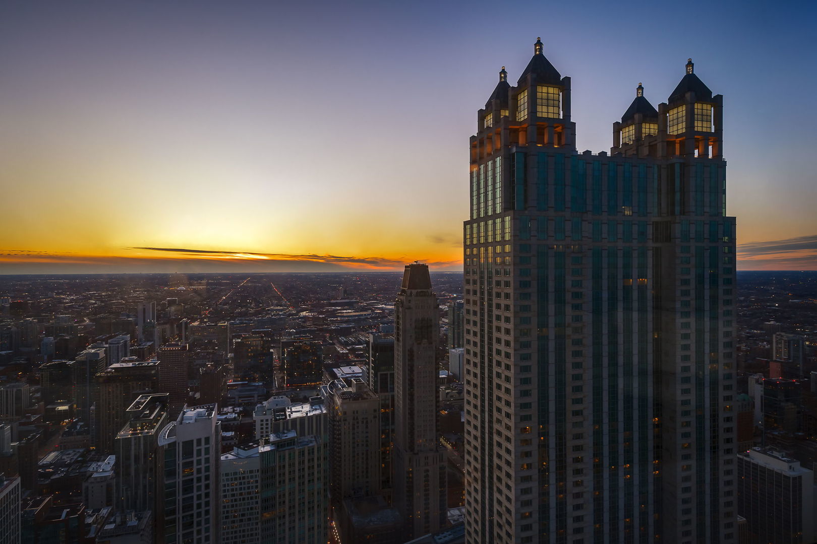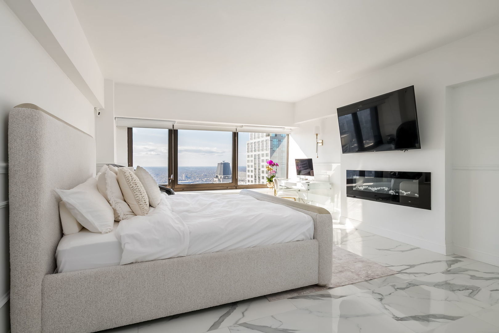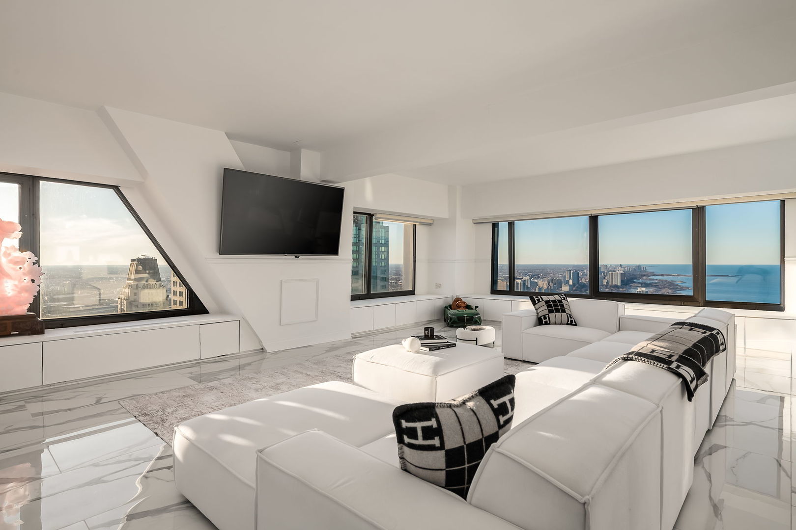 This stunning 3 bed/3.1 bath unit is not like anything you have seen before! Experience luxury living in this exquisitely remodeled northwest corner unit of the iconic John Hancock Building, offering breathtaking Lake Michigan views and stunning sunsets. The property has been completely reimagined by the current owners. The formal foyer features a custom Versace mosaic set in porcelain flooring, which flows throughout the home. Newly remodeled kitchen features custom cabinetry, quarts countertops, plenty of storage space, and a breakfast island seating. The spacious living and dining areas, two art galleries, a wet bar with a wine cooler, and a wide-open floor plan with a custom quartz fireplace mantle make this home perfect for entertaining. The primary suite boasts a spa-like bath with a soaking tub, oversized shower, and sauna, while a dedicated laundry room includes a washer, dryer, sink, and dry-cleaning machine. The building offers full amenities, including an indoor pool, a fitness center, 24-hour door staff, dry cleaners, a package room, on-site management, a bike room, two additional storage cages, and a grocery store on the 44th floor. Cat-friendly. Garage parking is available for an additional monthly fee. The location couldn't be more perfect: you are steps away from the lake, the beach, and top-notch dining and shopping along Michigan Ave and Oak Street. Enjoy happy hour at Gibson's Bar & Steakhouse, Maple & Ash for dinner, and more.
